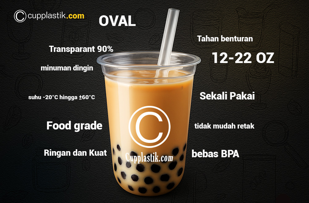 Dengan ketebalan plastik yang kokoh serta finishing transparan berkualitas tinggi, cup PET Oval memberikan nilai tambah pada branding minuman Anda. Cup ini sering digunakan oleh coffee shop, kedai jus, hingga minuman kekinian karena tampilannya eksklusif dan menarik perhatian pelanggan.