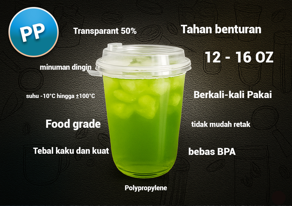 Bahan umumnya PP (Polypropylene) food grade, tahan suhu dingin hingga panas sedang (±100 °C), aman untuk minuman dingin maupun hangat, dan tidak mudah penyok.